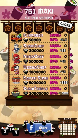 可愛いけどこれ寿司じゃねえよ! おにぎりだろ! このおにぎり(寿司じゃない)をひたすらクリックし、巻き寿司を生産し(握り寿司は一切出て来ない)、生産した巻き寿司でおばあちゃんを購入してまたひたすら巻き寿司を生産するゲーム。クッキークリッカーと全くおなじ。