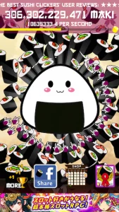 「おにぎりやんけ!!!」って突っ込んではいけません。これはガイジンが作ったゲームなので、れっきとした寿司なのです。 ちなみに背景で浮いてるのはおそらく巻き寿司、下からせり上がってる赤いのは醤油です。たぶん。 ゲーム内容はクッキークリッカーとまあ同じで、真ん中のおにぎr・・・ 寿司をクリックというかiOSなのでタップすると寿司が1MAKIずつ巻かれていき(どうやら握りはしない様子)、 巻いた寿司を使って自動で寿司を巻いてくれるauto clickerだったり寿司巻きマシーンだったり、 クッキーで言うババァに相当するGRANDMA(ババァみたいに強くなったりはしなくて、GEISHA CHEFとかのが強い) とかを購入すると、放っておいても自動で寿司が巻かれていくようになります。