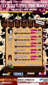 以前紹介してからは、いくつか自動クリックアイテムが増えていて、現在はNAMAHAGEが一番強く、 1つ買うたびにMPSが+20万されます。ただ買うごとにレベルが上がって購入に必要な寿司の数も増えるので、 今のレベル22からレベル23にするには約3兆巻きの寿司が必要みたいです。さすがに非効率なので他のレベルを上げた方がよい。