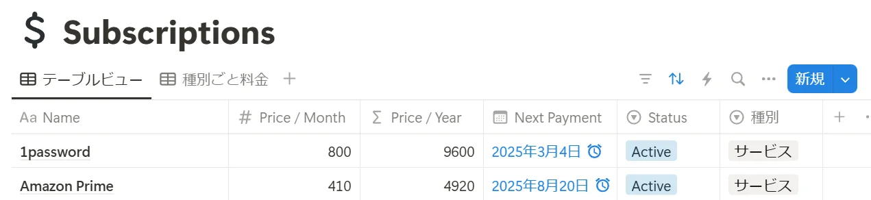 新しいカードに切り替わると、各種サービスの支払い方法を更新する必要が出てくる。これは特に定期的な支払いがあるサブスクで必要になるのだけど、Notionのデータベースでサブスク契約を一覧管理していたため、このリストを見ながら新カード情報に更新していくだけで済んだ。こうした管理をしておくと、サブスク支払額の可視化や更新時期の把握にも使えて便利。